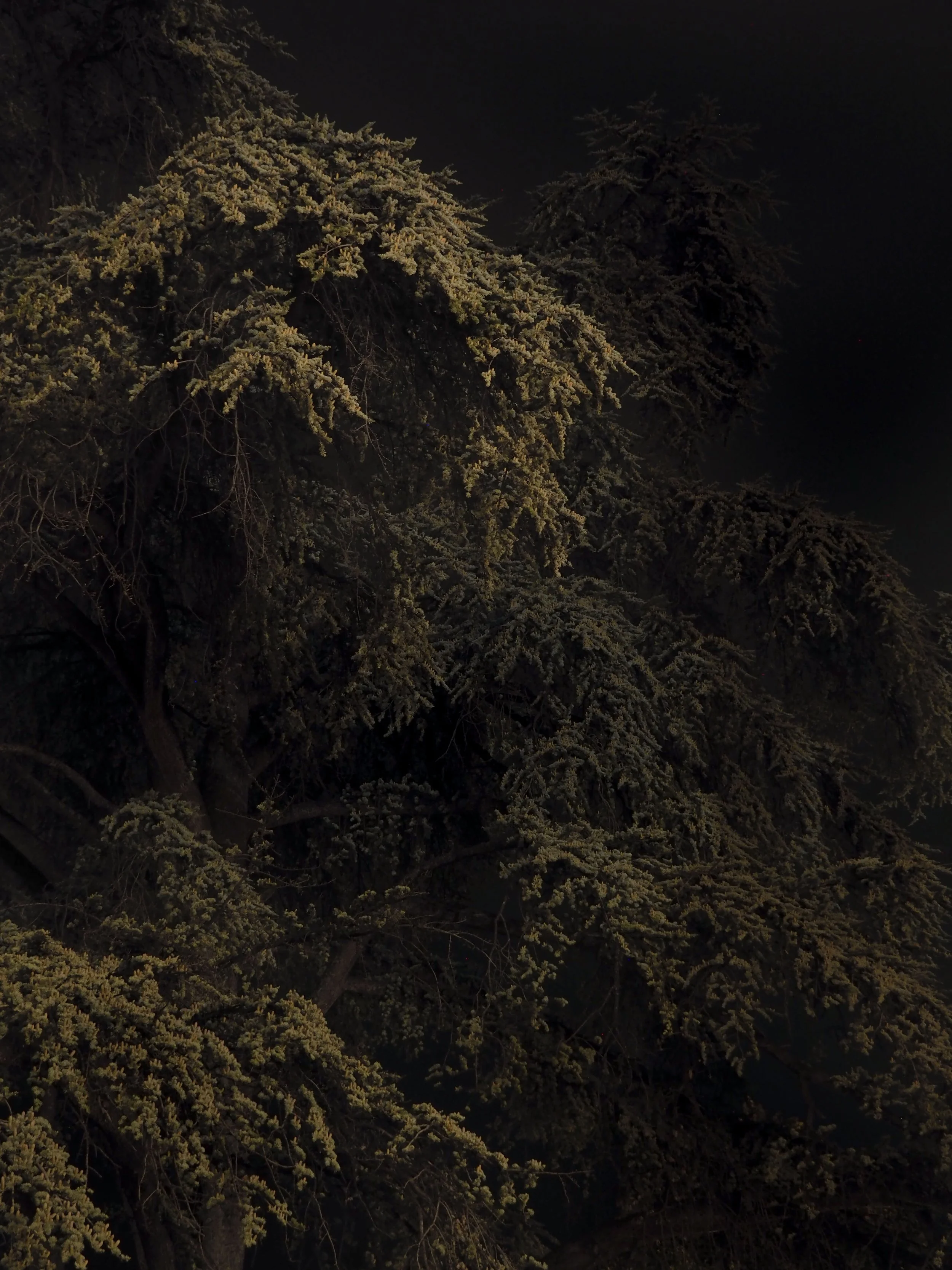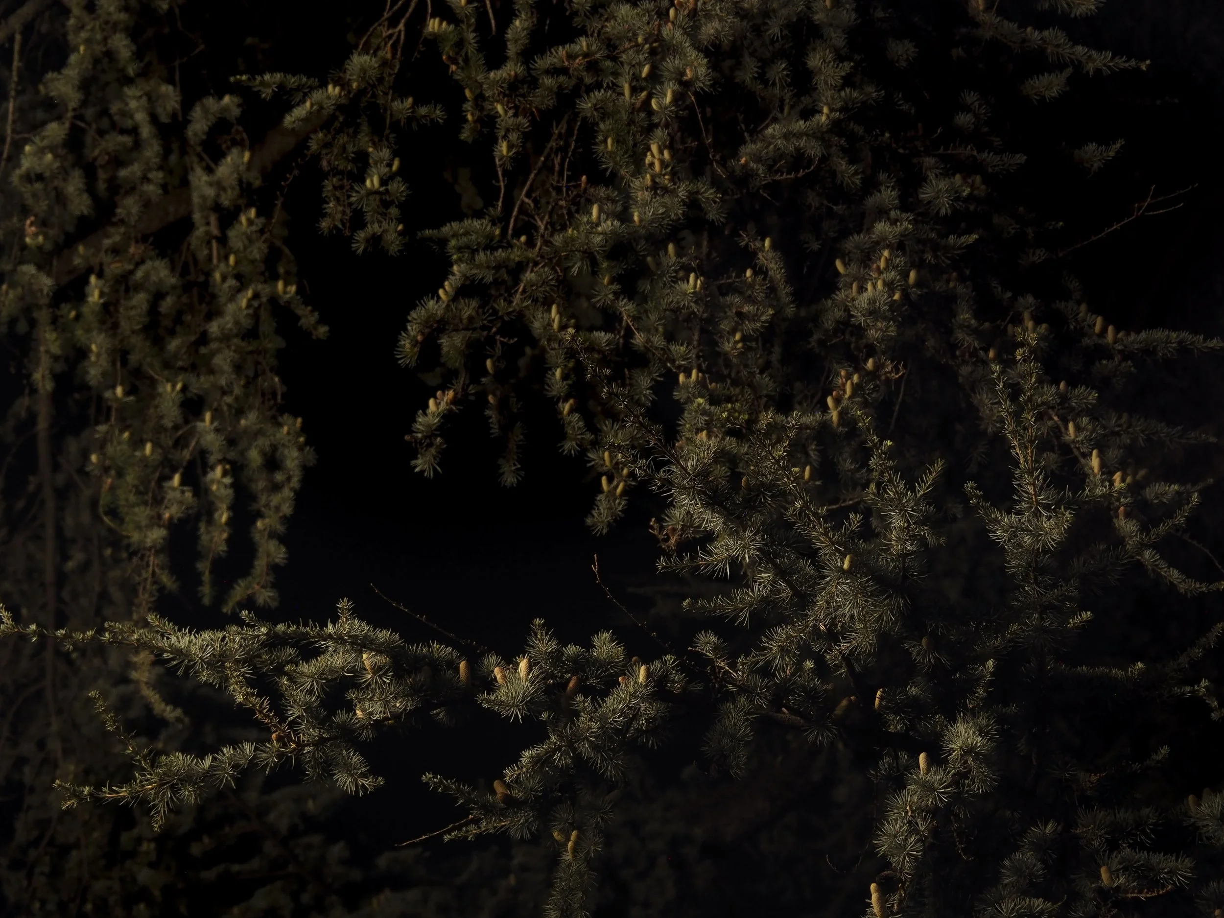 In my opinion, this magical feeling is closely connected to Bergson’s quote that “When things stop being useful, they start being”. The objects might no longer be able to function and serve a purpose, but the traces of time and sensation are still carried in them, preserving this intangible value quietly in the corner. Their presence is more about the emotion and meaning rather than its own utility. Moreover, the photos capturing the trees also remind me of Christmas and winter. The reflection of light on the pine needles at night creates a distortion that makes it appear like snow. Under the dim light, though the air is still warm, the pine trees seem to transform into something cold, quiet, and serene. Through these objects and moments, I started to see and feel how things began to be and exist, how memory and light recreate their value when they are no longer trapped in their utilities.